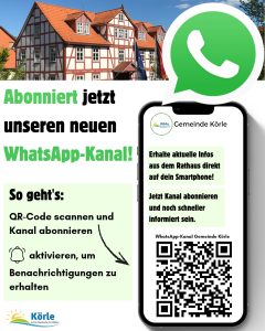 Für Nachrichten, die Sie besonders schnell erreichen müssen, gibt es jetzt den neuen WhatsApp-Kanal der Gemeinde Körle. Damit bekommen Sie wichtige Nachrichten direkt aufs Smartphone. Einfach abonnieren, Benachrichtigungen anschalten und