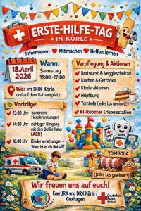 Das Jugendrotkreuz und das DRK Körle/Guxhagen laden gemeinsam zum Erste Hilfe-Tag ein. Dieser findet statt am Samstag, 18. April, von 11 bis 17 Uhr auf dem Rathausplatz. Geplant sind Vorträge