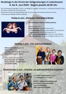 Vom 6. bis 9. Juni finden wieder die Musiktage in der Kirche der Seligpreisungen in Lobenhausen statt. Beginn ist jeweils um 19.30 Uhr. Der Eintrittspreis beträgt € 20,00 – ermäßigt