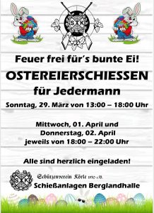 Die Osterfeiertage rücken näher und deshalb heißt es beim Schützenverein Körle auch wieder „Feuer frei fürs bunte Ei“. Der Verein lädt zum Ostereierschießen in den Schießkeller der Berglandhalle ein. Schießen