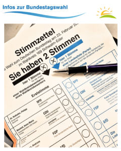 Die Wahl zum 21. Deutschen Bundestag wird als vorgezogene Neuwahl am 23. Februar 2025 stattfinden. Alle Wahlberechtigten bekommen hierfür im Januar die Wahlbenachrichtigungen per Post gesandt. Auch bei dieser Wahl
