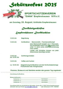 Der Sportschützenverein Diana Empfershausen feiert am Sonntag, 24. August sein Schützenfest. Dieses findet an der Grillhütte in Empfershausen statt.
