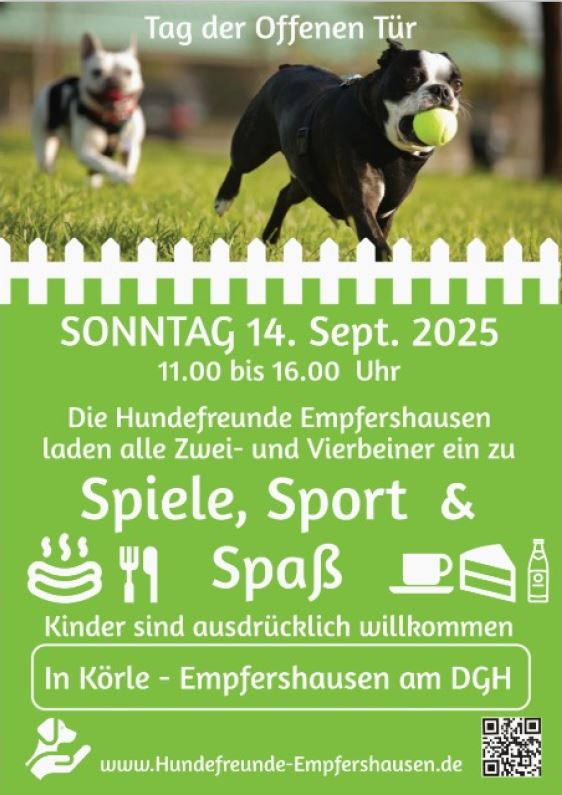 Zu einem Tag der offenen Tür lädt der Verein Hundefreunde Empfershausen für Sonntag, 14. September ein. Von 11 bis 16 Uhr gibt am Dorfgemeinschaftshaus in Empfershausen Spiele, Sport und Spaß für Zwei- und Vierbeiner.