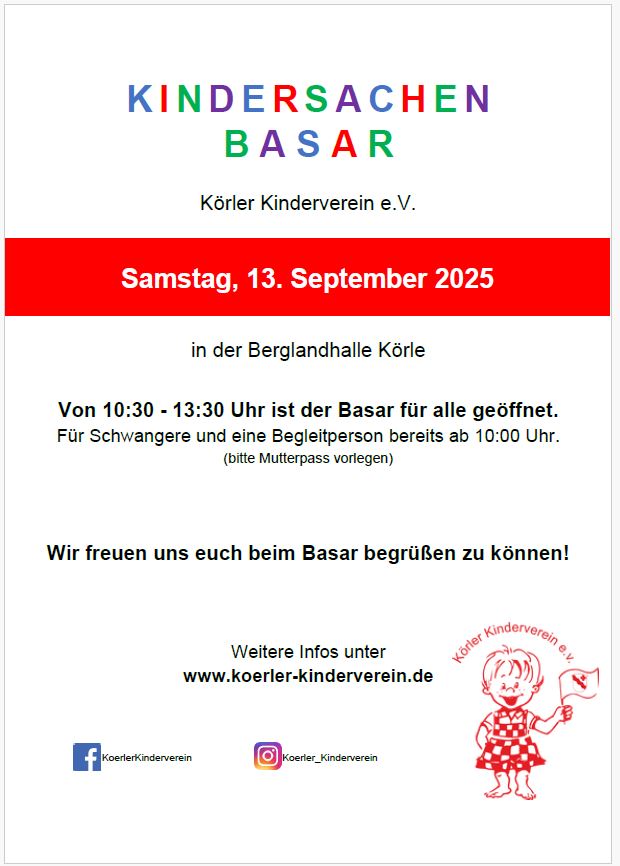 Der Körler Kinderverein lädt zum Kindersachenbasar ein. Dieser findet am Samstag, 13. September von 10.30 bis 13.30 Uhr statt.