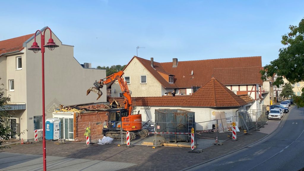 Wo Neues entsteht, muss Altes Weichen: Derzeit laufen die Abrissarbeiten für den ehem. Lebensmittelmarkt. Der Abriss des eingeschossigen Gebäudeteils schafft Platz für den Neubau der Tagespflegestation und von sieben Wohnungen, die innerhalb der nächsten zwei Jahre am Dorfplatz entstehen.