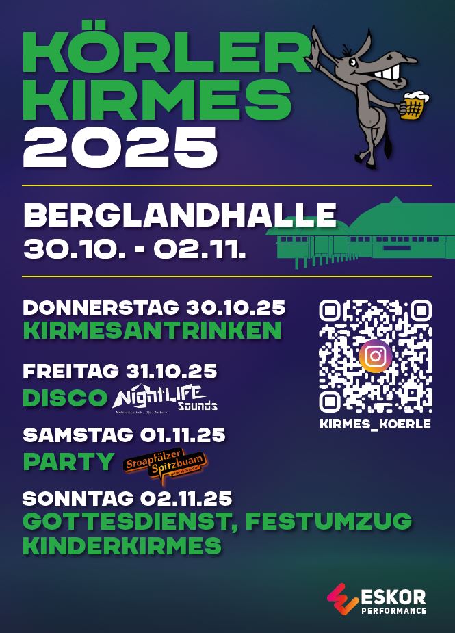 Vier Tage lang steht die Berglandhalle bald wieder Kopf: Denn am letzten Oktoberwochenende lädt das Kirmesteam Körle zur Körler Kirmes ein. Am Donnerstag, 30. Oktober geht’s um 17.30 Uhr los mit einem Schlachteetssen in der Berglandhalle (Anmeldung erforderlich), um 20 Uhr wird die Halle für die Party mit DJ Pro Sound geöffnet. Einen Tag später geht’s weiter mit NightLife Sounds ab 20 Uhr. Früher am Tag startet der Kirmessamstag. Ab 11 Uhr gibt’s aufm Dorfplatz einen musikalischen Frühschoppen mit Kirmessuppe, ab 19.30 Uhr heizen dann die Stoapfälzer Spitzbuam in der Berglandhalle ein. Der Kirmessonntag beginnt um 10 Uhr mit einem Gottesdienst in der Körler Kirche, weiter geht’s um 11 Uhr mit einem Frühschoppen auf dem Dorfplatz, bevor sich ab 14 Uhr der traditionelle Festumzug durchs Dorf bis zur Berglandhalle schlängelt. In der Halle gibt es ab 15 Uhr Kaffee und Kuchen, um 15.30 Uhr startet die Kinderkirmes. Den Kirmes-Abschluss bilden die Auslosung der Tombola und gemütliches Beisammensein ab 18 Uhr.