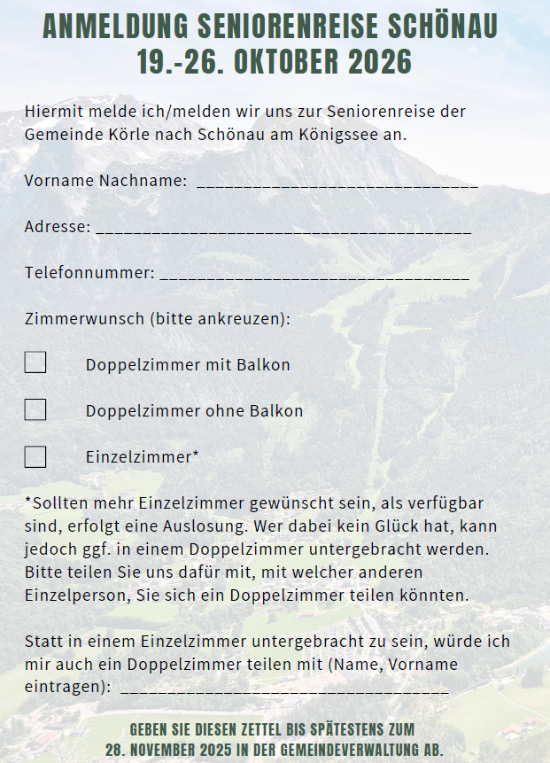 Oktober 2026 einen einwöchigen Aufenthalt im Berchtesgadener Land. Das kreiseigene Buchenhaus ist in der Zeit vom 19. bis 26. Oktober für 60 Gäste aus Körle reserviert.