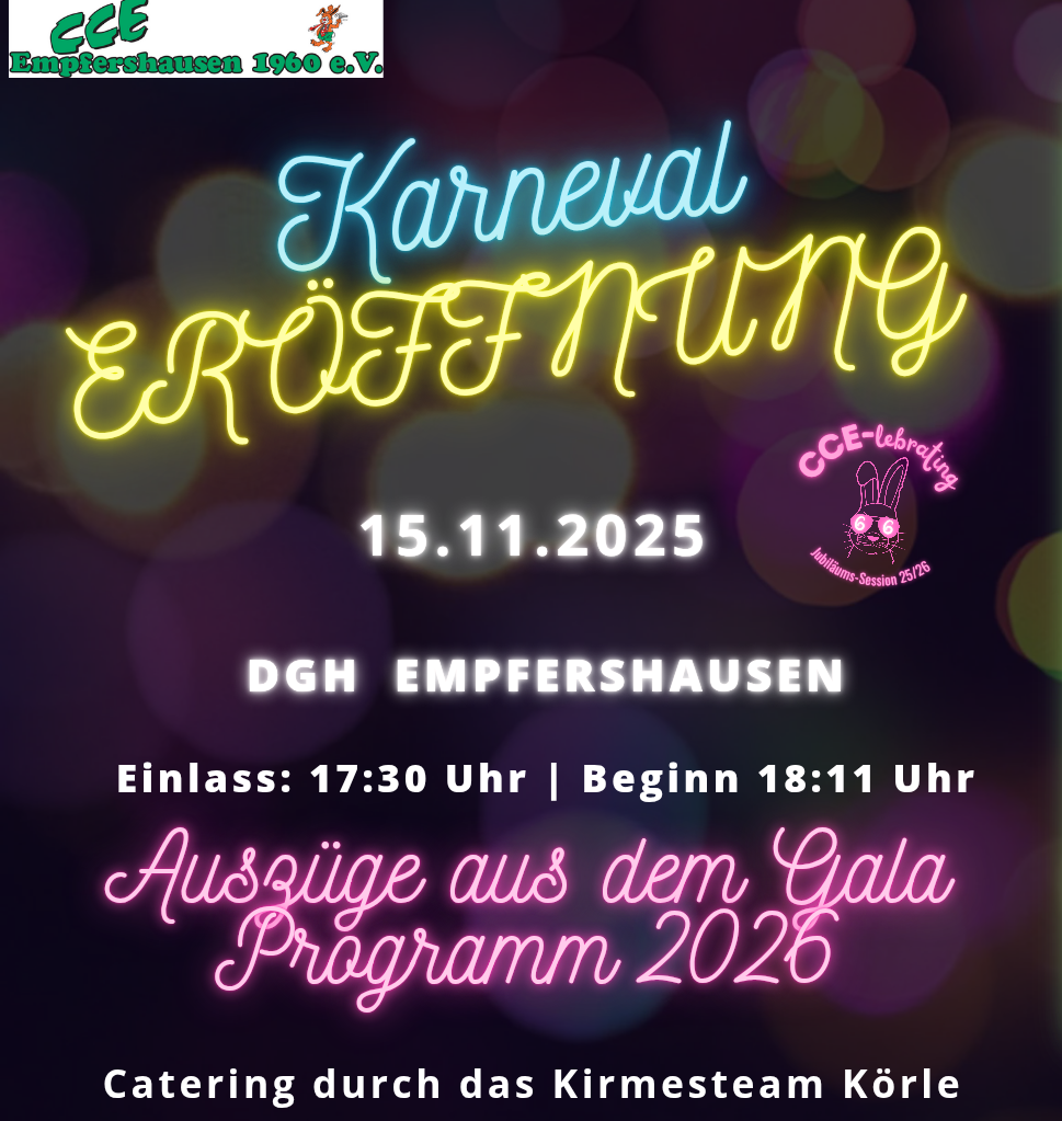 Der CCE Empfershausen lädt zur Sessionseröffnung 2025/2026 ein. Am Samstag, 15.11. gibt es ab 18.11 Uhr im DGH Empfershausen Auszüge aus dem Gala-Programm 2026 zu sehen.