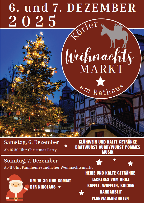 Am ersten Adventswochenende findet auf dem Körler Rathausplatz der Weihnachtsmarkt statt. Zunächst lädt das Kirmesteam Körle für Samstag, 6. Dezember ab 16.30 Uhr zur X-Mas-Party ein. Es gibt Musik, Glühwein, kalte Getränke sowie Brat- und Currywurst und Pommes. Der familienfreundliche Weihnachtsmarkt findet dann am Sonntag, 7. Dezember, ab 11 Uhr statt. Unter Mitwirkung einiger Körler Vereine gibt es beispielsweise heiße und kalte Getränke, einen Grillstand, Waffeln, Kuchen sowie einen Stand mit Handarbeiten und Selbstgestricktem. Für die jungen Besucher werden beispielsweise Planwagenfahrten angeboten. Außerdem kommt um 16.30 Uhr der Nikolaus und verteilt Geschenke.