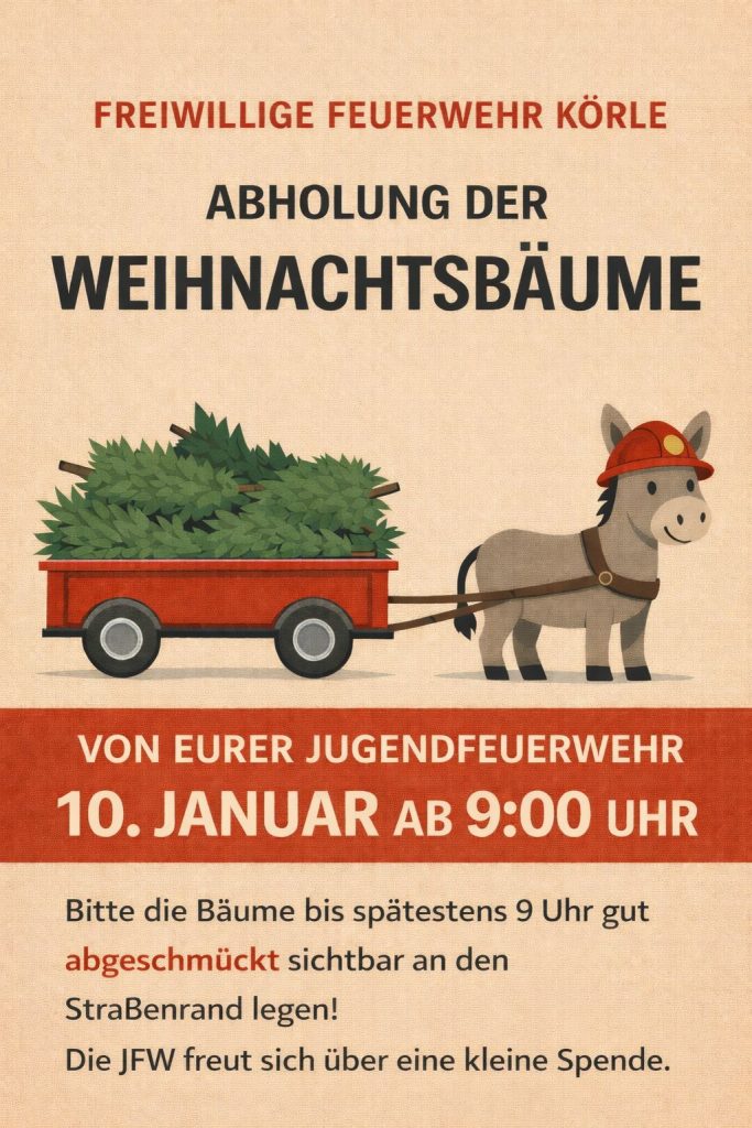 Die ausgedienten Weihnachtsbäume werden in allen Ortsteilen am Samstag, 10. Januar, ab 9 Uhr von den Jugendfeuerwehren abgeholt. Bitte die Bäume abgeschmückt und gut sichtbar am Straßenrand platzieren. Die Jugendfeuerwehr freut sich über eine kleine Spende.
