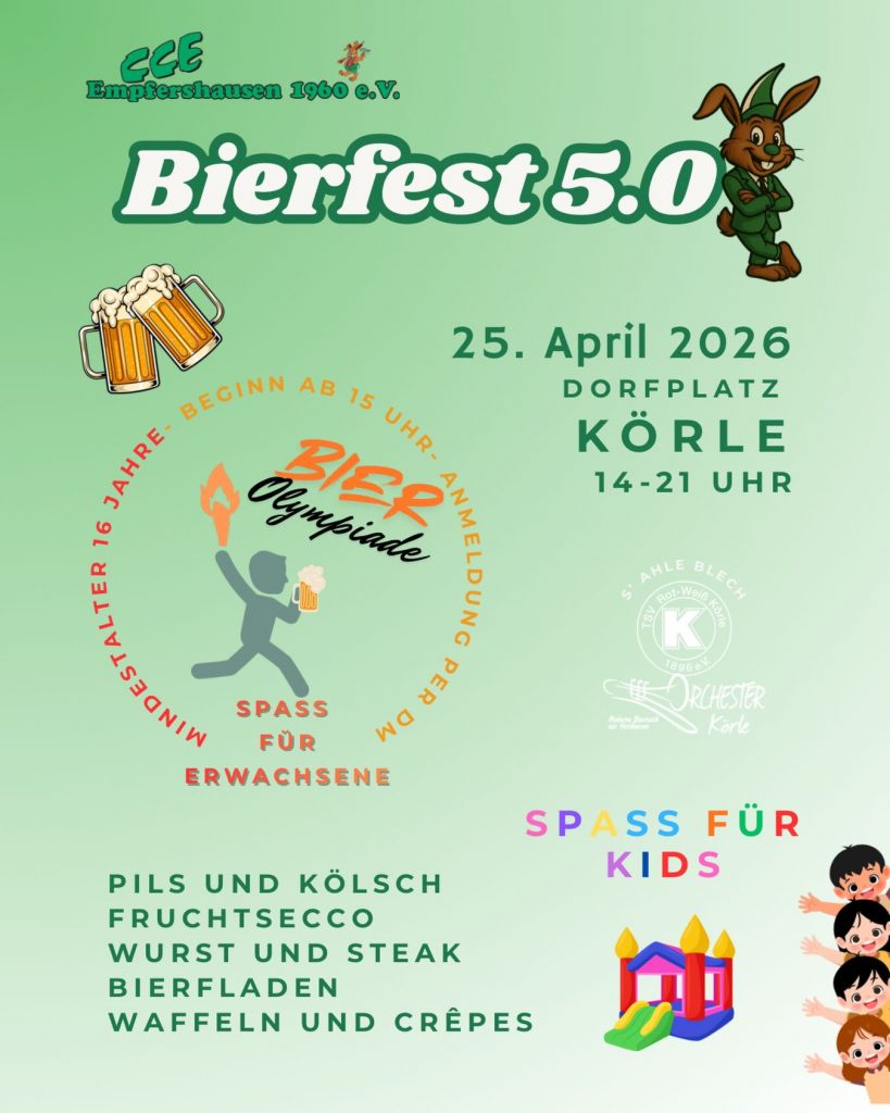 Zum fünften Mal findet am kommenden Samstag, 25. April das Bierfest auf dem Körler Dorfplatz statt. Ab 14 Uhr gibt es unter anderem Leckeres vom Grill, Süßes und natürlich ein umfassendes Getränkeangebot. Für die Musik sorgen s Ahle Blech und das Orchester Körle.