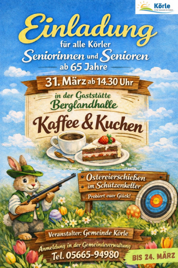 Die Gemeinde Körle bietet regelmäßig Veranstaltungen für Senioren an. Einmal im Jahr findet gewöhnlich eine Busreise statt, zu der alle Einwohnerinnen und Einwohner ab 65 Jahre eingeladen sind. In der Bürgerzeitung „Kuckuck und Esel“ sowie hier auf unserer Internetseite veröffentlichen wir, sobald ein Termin und Details für die nächste Fahrt feststehen. Im Jahr 2025 ging es für die Teilnehmerinnen und Teilnehmer in die Rhön.